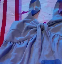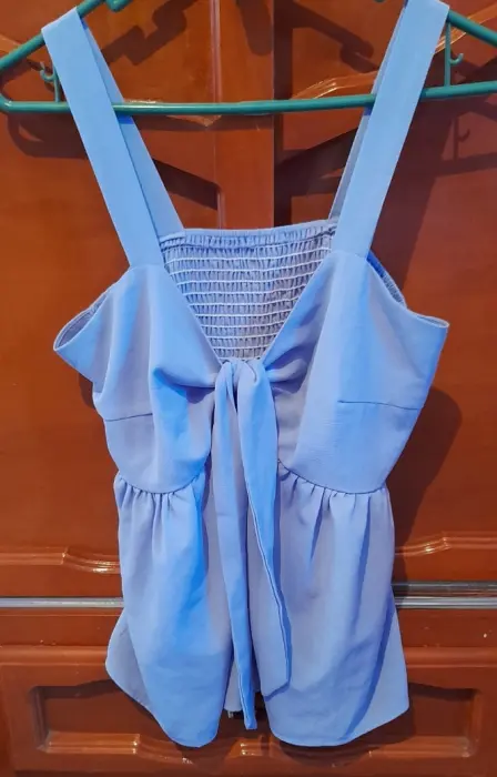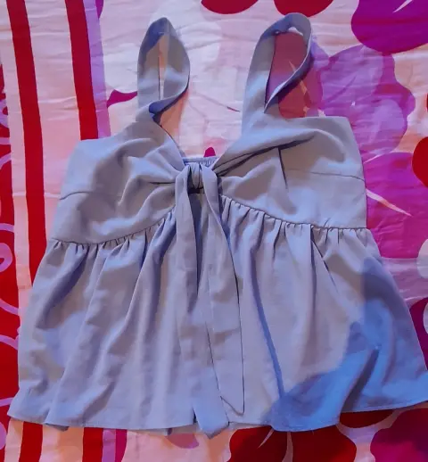 LINDA BLUSA●Tela suave y fresca.●Bonito diseño al frente y en la parte de atrás.●Tiene una pequeña marchita muy leve en la parte de atrás. ●Tiene resorte ennel pecho.Sus medidas son: ▪︎ANCHO 51 cm ya estirando todo el resorte.▪︎LARGO 37 cm