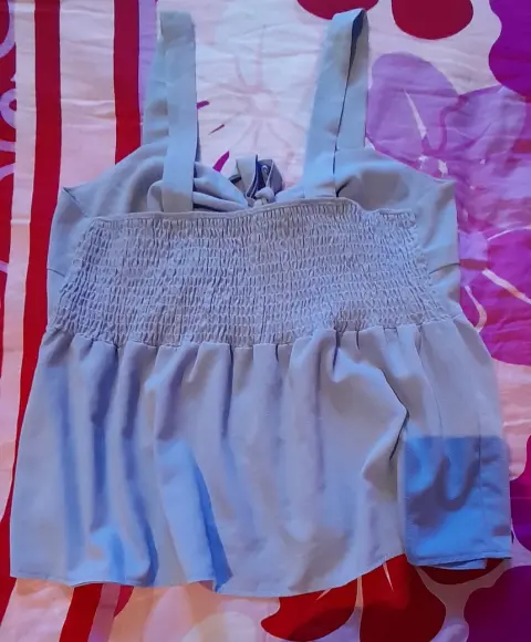 Blusa de tirantes. LINDA BLUSA●Tela suave y fresca.●Bonito diseño al frente y en la parte de atrás.●Tiene una pequeña marchita muy leve en la parte de atrás. ●Tiene resorte ennel pecho.Sus medidas son: ▪︎ANCHO 51 cm ya estirando todo el resorte.▪︎LARGO 37 cm