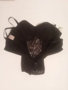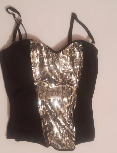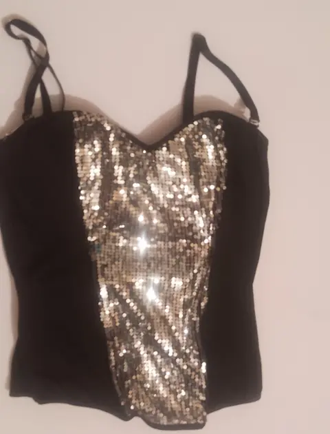 Bonita blusa de tirantes, tipo corsette, trae varillas de soporte, color gris con plateado, tiene lentejuela en el frente, bonito diseño talla M/L, mide en pecho 32 cm, en cintura 30 CM y de largo tiene 46 cm. En buen estado.