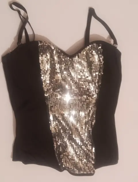 Blusa de tirantes. Bonita blusa de tirantes, tipo corsette, trae varillas de soporte, color gris con plateado, tiene lentejuela en el frente, bonito diseño talla M/L, mide en pecho 32 cm, en cintura 30 CM y de largo tiene 46 cm. En buen estado.