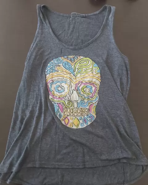 Blusa de tirantes, con estampado de calavera, me la regalón pero se le borro la etiqueta de donde es, en perfecto estado sin detalle, con una chamarra de cuero negra queda super linda