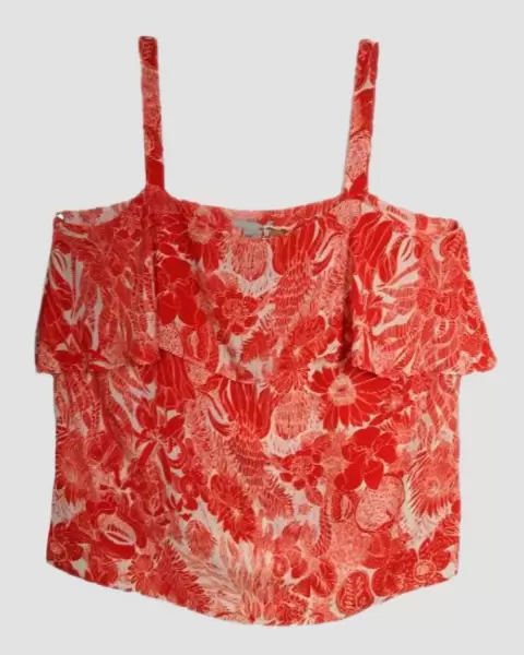 Hermosa blusa de tirantes con olanes en el pecho, tela fresca y cómoda. Súper coqueta y linda, colores en tendencia, rojo, naranja y blanco.