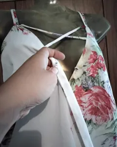 Blusa de tirantes cruzados, color blanca con verde y rojo ( floreada) es sueltita pero tiene elástico en la parte de abajo. Tiene un pequeño botoncito en la parte de enfrente.
