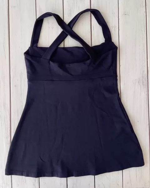 Blusa de tirantes cruzados en la espalda color azul profundo/morado. Queda pegado, la tela es suave, es corte princesa y queda ajustada al busto y luego abre un poco, línea A.Talla: XSMedidas: 32 cm de axila y 38 cm de largo desde la espalda.