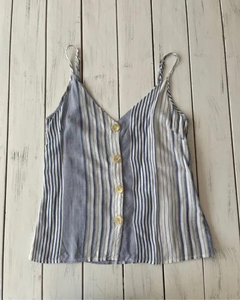 Talla: XS, blusa con tirantes ajustables, escote en V, se abotona al frente, a rayas azules, muy fresca y ligera, medidas: 38 cm de axila y 32.5 cm de largo.