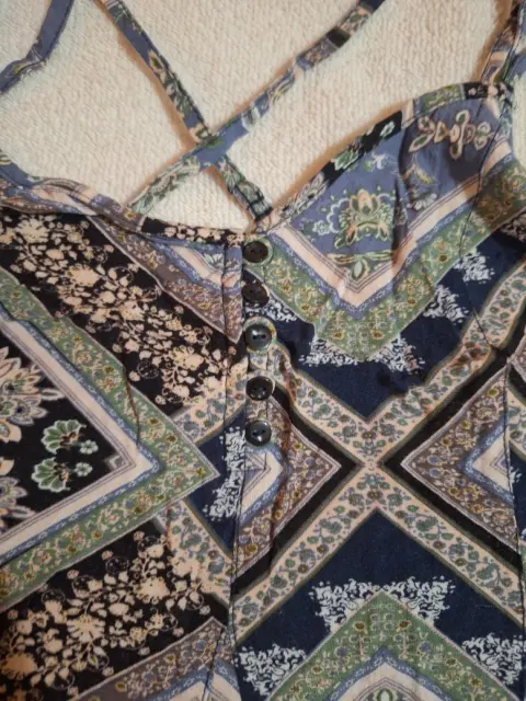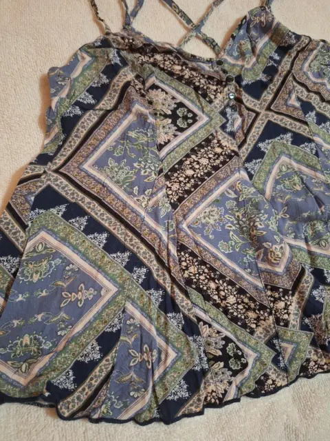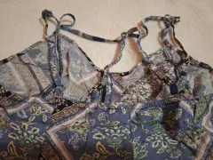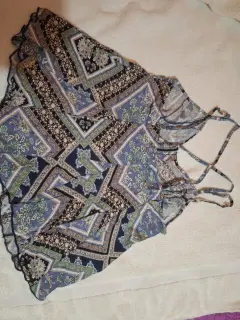 Fresca y hermosa blusa de tirantes. Tiene 4 tirantes que la hacen lucir fuera de lo común, son ajustables. Es algo olgadita de la parte de abajo. Tiene botones en la parte de enfrente, no se abren, son como adorno coqueto. En la parte de atrás Tiene resorte para que se amolde a tu espalda.