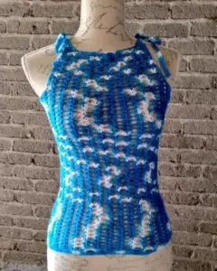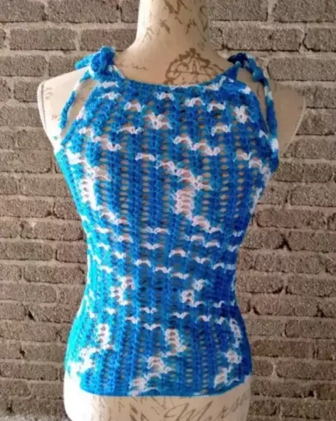 Blusa tejida a mano de tirantes en color Azúl cielo con blanco talla s totalmente nueva, es comoda y fresca para la calor. Ya solo nos queda 1 pieza