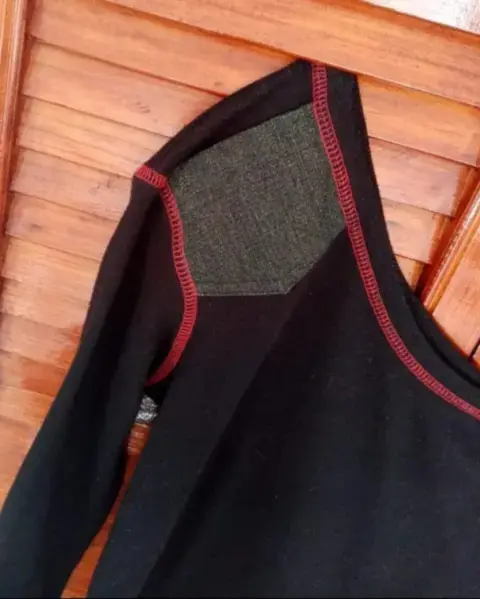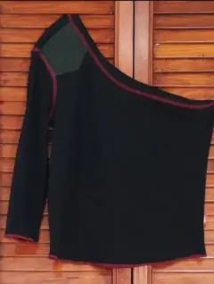 Bonita blusa color negro de un hombro con detalle de bolsita color mezclilla, costuras en rojo.La talla viene reducida queda bien a alguien que es talla S