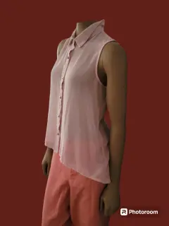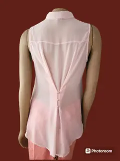 Blusa de Vestir Sans Sousi. Blusa de Vestir Sans Sousi, talla mediana, color rosa palido, cuello alto en V, sin mangas, botones de copa dorados, tela transpirable de poliéster, cola de pato, espalda con detalles de botones dorados, mide 28cm de hombro a hombro, 45cm de axila a axila, 44cm de cintura, 57cm del hombro hacia abajo al frente y 72cm de la parte de atras, previamente usada en buen estado cosmetico.