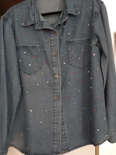 Linda blusa de mezclilla con cristales al frente, la puedes utilizar como sobre camisa, esta lista para estar en tu clóset