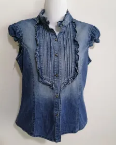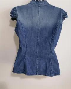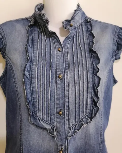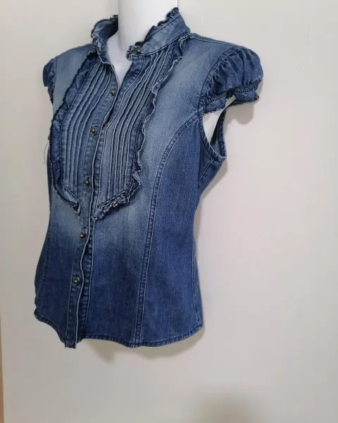 Blusa denim premium estilo Vintage. ❇️visita el resto de mi closet hay prendas super lindas, Si te gustaron varias prendas puedes armar tu paquete & MEJORAMOS considerablemente el precio precio ❇️✨HACEMOS ENVÍOS DIARIO✨Estiliza tu figura padrisimo. SUPER TENDENCIA. Hermosa & versátil.Talla M, marca cien por ciento, medidas de axila a axila 37, largo 60Tiene un poquito suelto algunos botones solo es coserlos no afecta a lo estetico