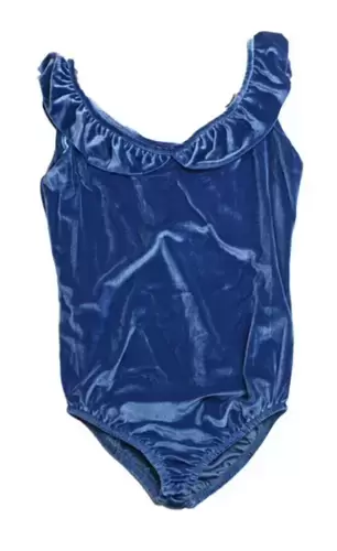 Blusa body azul tipo terciopelo con volados en el escote y tirantes gruesos con broches en la parte baja, super Linda.
