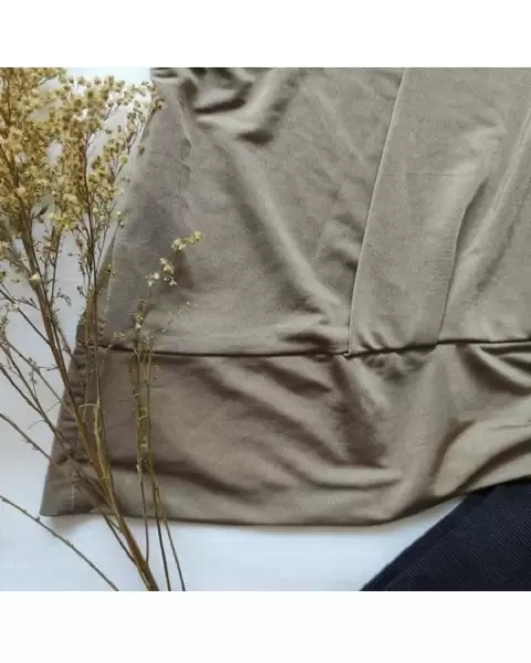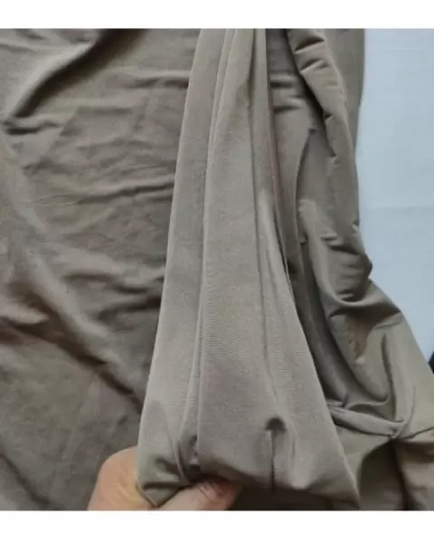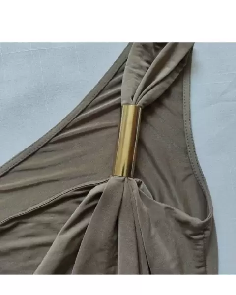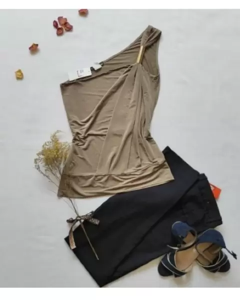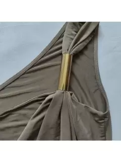 Bonita blusa color capuchino brillos, la tela estira y tiene detalle dorado en un hombro que sostiene al tirante y una banda ancha de tela que va por delante desde el hombro hasta la parte baja de la blusa.