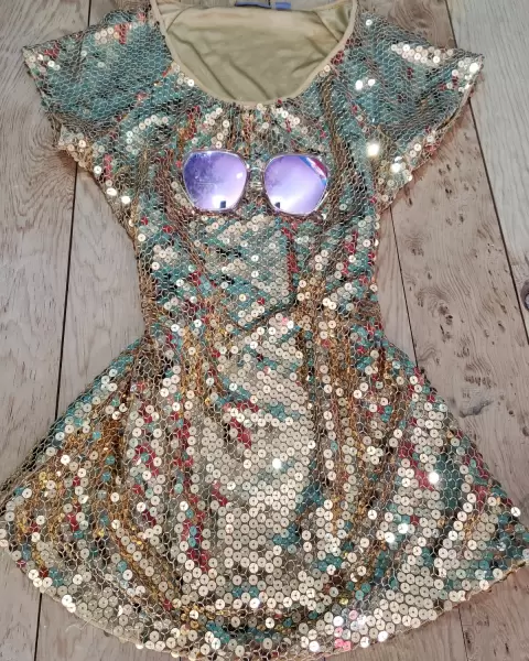 Llamativa blusa de lentejuela dorada, para llamar la atención a donde quiera que vayas. Tiene algunos detalles pero no afecta nada a la estética.