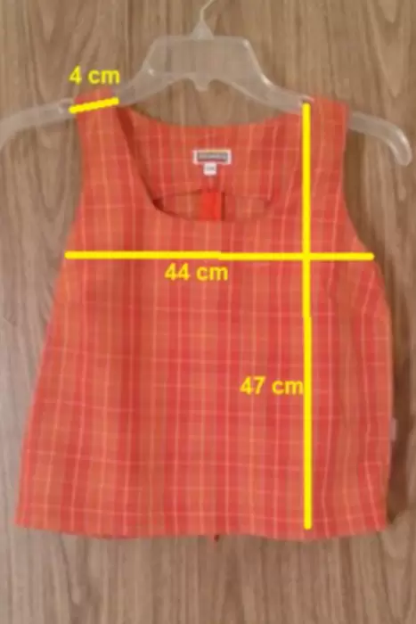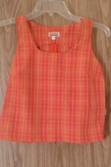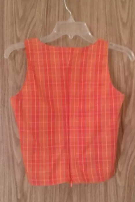 Esta preciosa Blusa a cuabros color naranja Talla Chica, se ve espectacular ya sea con pantalòn de vestir o jeans.Comoda , alta costura ya que su cierre es oculto en tonalidad al color de la tela.Te quedarà espectacular.