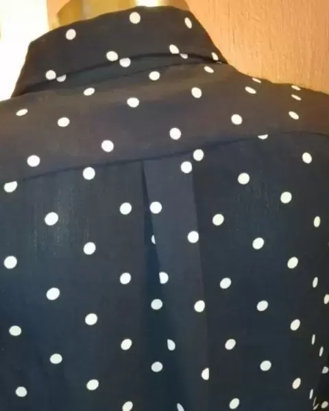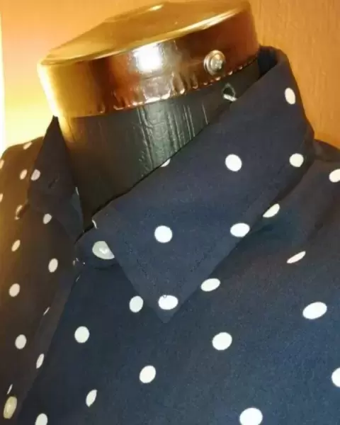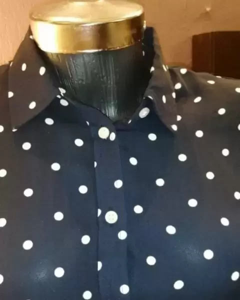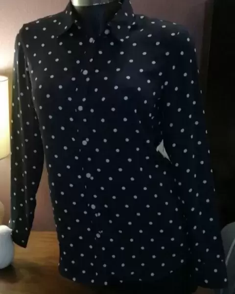 * Marca: Banana Republic* Color: Fondo azul marino y boleado blanco* Talla: XS* Manga larga :59 cms.* Largo total blusa:67 cms*Composición de la tela: 100%poliéster*Botones al frente.*Ancho de axila a axila : 50 cms.* En excelente estado* Se entrega sanitizado