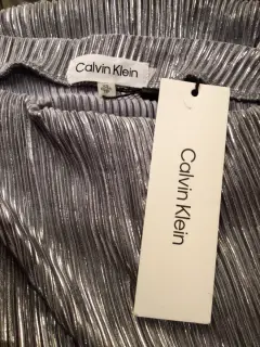 BLUSA ELEGANTE CALVIN KLEIN. BLUSA MARCA CALVIN KLEIN, TALLA XS, STRECH, PLATEADA CON ETIQUETA SIN MANGAS CON PLIEGUES EN UN COSTADO, FRESCA, TELA SUAVE, CUELLO DE OJAL COMBINABLE CON PANTALÓN, FALDA ETC.