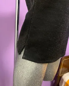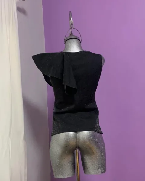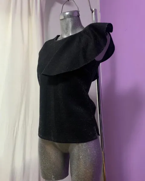 Blusa elegante con brillos. Hermosa blusita con holán en el hombro izquierdo y brillos, es muy elegante. Le va bien a una talla chica o mediana. Sus medidas son: 57cm de largo y 42cm de axila a axila