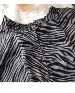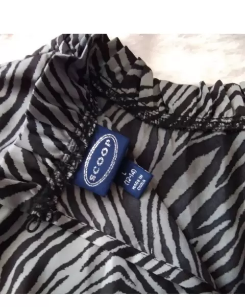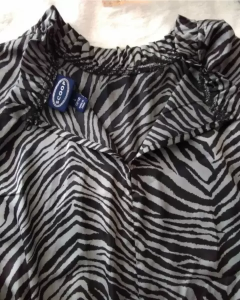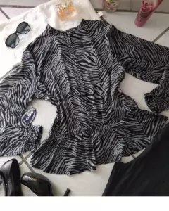 Blusa elegante Zebra. Demasiado elegante y formal, con Peplum. Usala con jeans o con leggins o de vestir. Tela 96% poliester y satinada, tono gris con negro. Talla L. Mide de axila a axila: 53 cm y de largo: 57 cm.