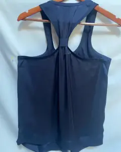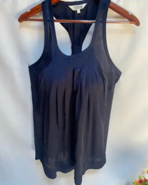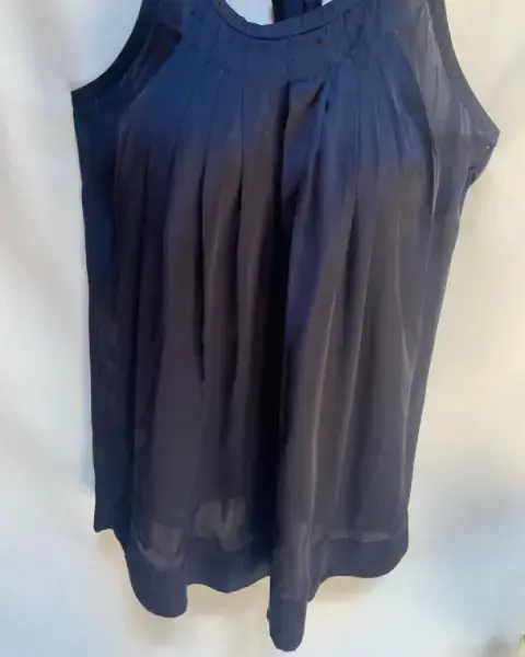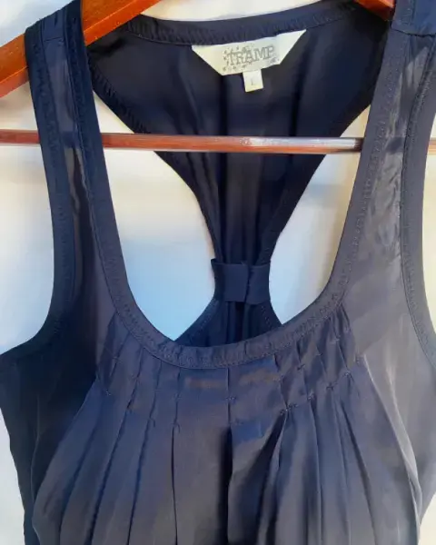 Blusa en tirantes gruesos, escote en “U”. Pinzas en escote y tablones a lo largo de la parte delantera. Tela en viscosa.Talla: L ( 34-36) Puede quedar hasta una XL.Marca: TRAMP.