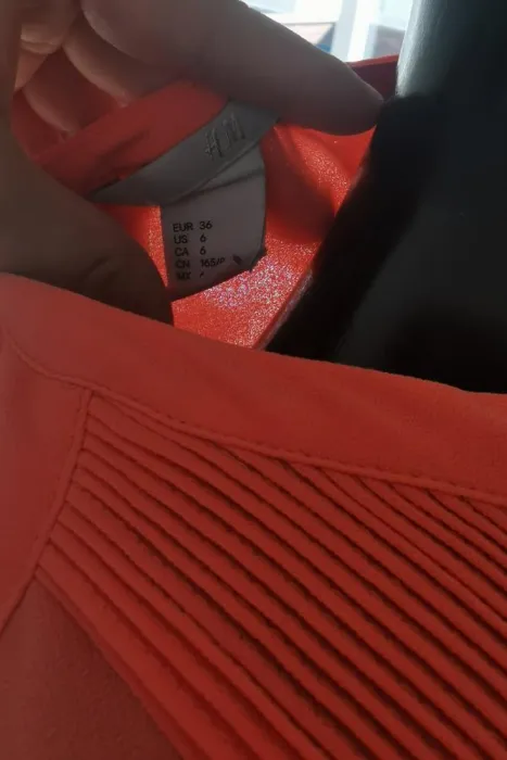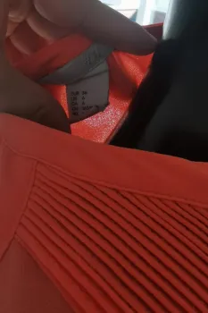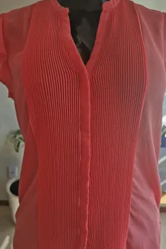 Blusa en tono neon de manga corta formal. Blusa en tono naranja color neon, con botones al frente, manga corta con caida suelta, escote en V y la tela se transparenta