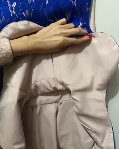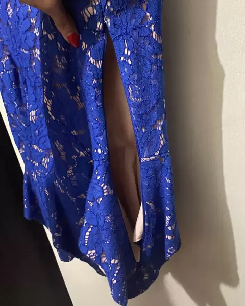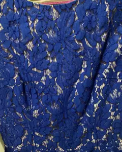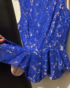 Hermosa blusa azul rey completamente de encaje, forro de abajo es satin rosa palo. Se abrocha por un lado con zíper (ver foto) con olanes en la parte de la cintura hacia abajo.