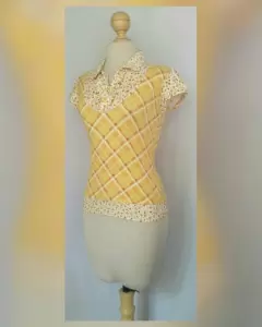 Blusa entallada estilo campesino c/estampado floral en tonos AMARILLOS/NARANJAS, cuello clásico c/solapas, escarolas y botonadura simulada, manga corta abullonada terminada en elástico. Talla EG (MUY REDUCIDA, da a S/M). Dimensiones: 38 hombro, 41 axila, 35 cintura, 43 zona baja, 58 largo, 11 largo manga.92% rayón, 8% spandex. P/lavado en casa.**SIN DETALLES, SE USO SOLO UNA VEZ P/UN PAR DE HRS**