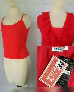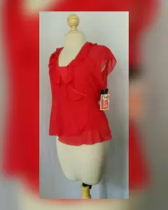 Blusa Envolvente con Escarolas. Blusa envolvente semitransparente color ROJO FUEGO, cuello pico c/escarolas zona frontal, 2 tiras laterales p/regular cintura, manga sisa y tank top mismo tono incluido p/usarse como corpiño. Talla 34 (REDUCIDA, da mejor a 30/32). Dimensiones cms: 36 hombro, 51 axila, 44 cintura (autoregulable), 54 zona baja, 60 largom Tank top: 46 axila, 48 zona baja, 37 largo (sin tirantes). 100% poliéster.