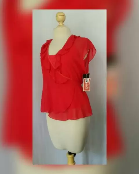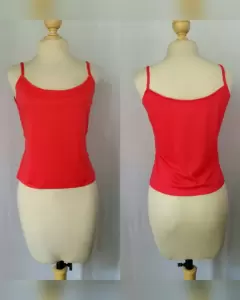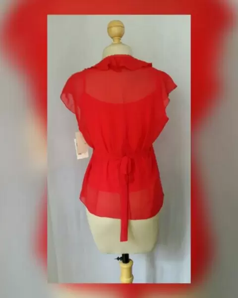 Blusa envolvente semitransparente color ROJO FUEGO, cuello pico c/escarolas zona frontal, 2 tiras laterales p/regular cintura, manga sisa y tank top mismo tono incluido p/usarse como corpiño. Talla 34 (REDUCIDA, da mejor a 30/32). Dimensiones cms: 36 hombro, 51 axila, 44 cintura (autoregulable), 54 zona baja, 60 largom Tank top: 46 axila, 48 zona baja, 37 largo (sin tirantes). 100% poliéster.