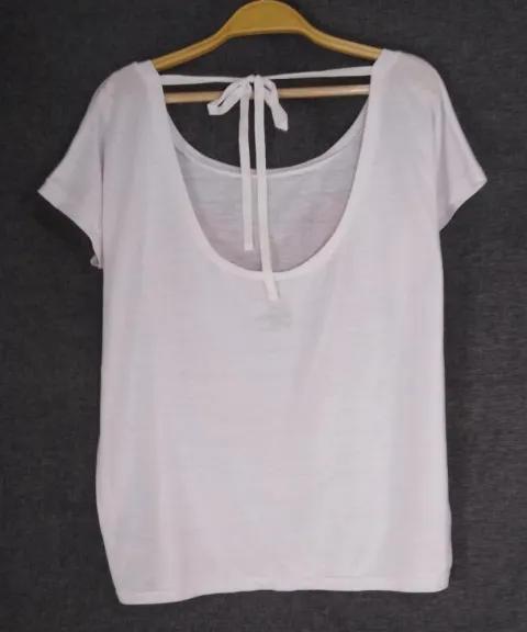 Blusa escote espalda y estampado al frente. 158 Blusa escote espalda y estampado al frente. Manga sisa. Color Blanco. Composición: 85% Polyester, 15% Nylon. Medidas: Busto 54 - Largo 58 cm. Sin detalles, está en perfecto estado.