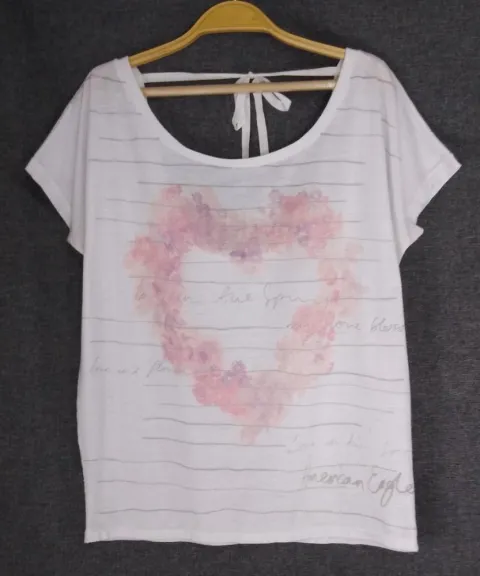 158 Blusa escote espalda y estampado al frente. Manga sisa. Color Blanco. Composición: 85% Polyester, 15% Nylon. Medidas: Busto 54 - Largo 58 cm. Sin detalles, está en perfecto estado.