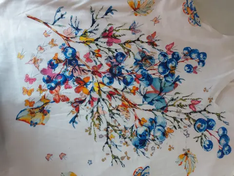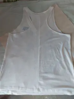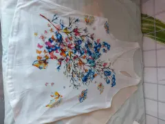 Blusa estampada. Blusa blanca sin mangas, olgada, estampado colorido, tela fresca