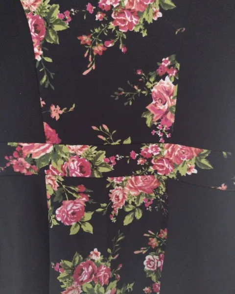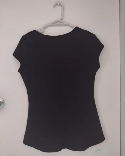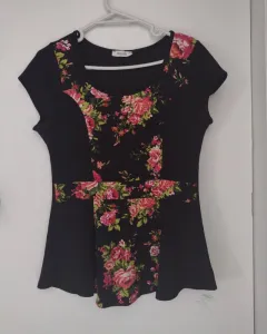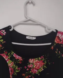 Bonita blusa con un estampado floral que no abarca toda la blusa se ve muy seria de la parte de atrás es totalmente negra es pulgada de la parte de abajo está muy padre queda con cualquier outfit que escoges.