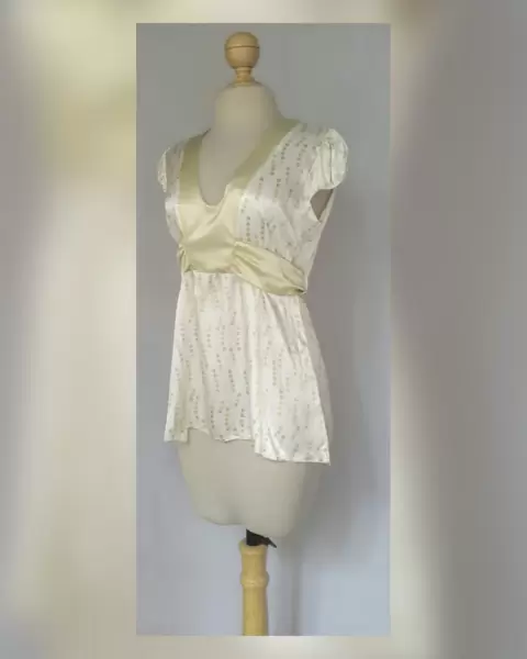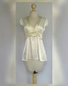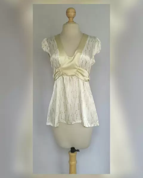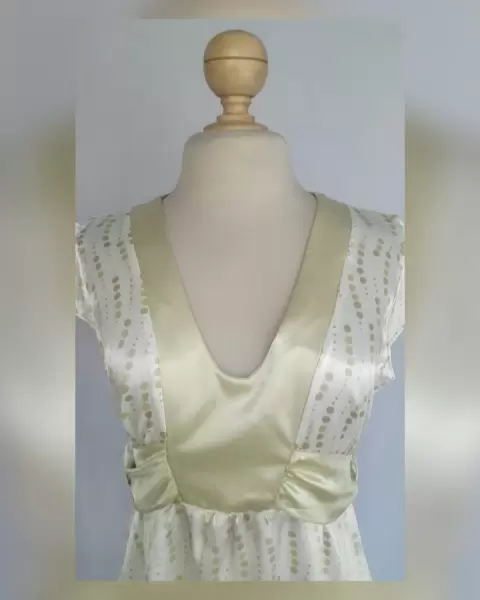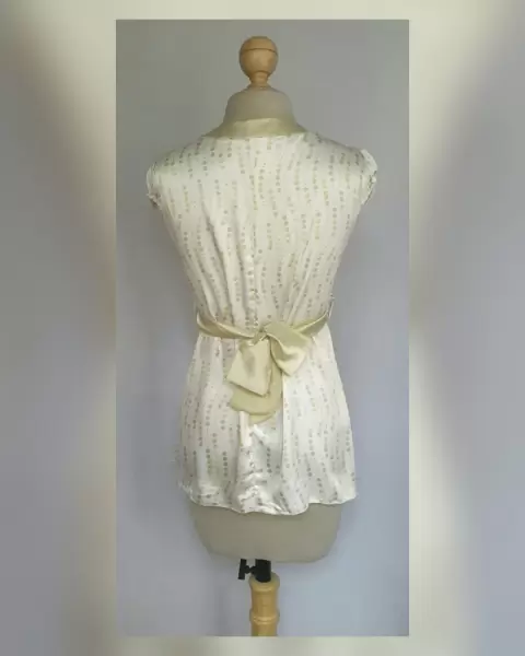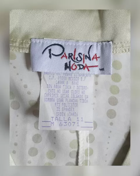 Blusa en base color MARFIL c/estampado circulos tonos VERDES/DORADOS, cuello V c/bies en contraste color VERDE OLIVO, cinto integrado en contraste tono VERDE OLIVO, trabillas en cintura, manga corta c/elástico. Talla 11 (MUY REDUCIDA, da mejor a 9). Dimensiones cms: 40.5 hombro, 52 axila, 46.5 cintura (regulable por el cinto) 66 zona baja, 62.5 largo, 8.5 cms largo manga. 97% poliéster, 3% spandex. Para lavado en casa.***SIN DETALLES, SE USO SOLO UNA VEZ POR UN PAR DE HORAS***SE ENTREGA LAVADA Y DEODORIZADA***