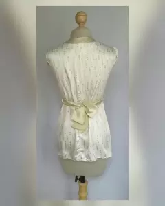 Blusa Estampada con Cinto MARFIL/VERDE. Blusa en base color MARFIL c/estampado circulos tonos VERDES/DORADOS, cuello V c/bies en contraste color VERDE OLIVO, cinto integrado en contraste tono VERDE OLIVO, trabillas en cintura, manga corta c/elástico. Talla 11 (MUY REDUCIDA, da mejor a 9). Dimensiones cms: 40.5 hombro, 52 axila, 46.5 cintura (regulable por el cinto) 66 zona baja, 62.5 largo, 8.5 cms largo manga. 97% poliéster, 3% spandex. Para lavado en casa.***SIN DETALLES, SE USO SOLO UNA VEZ POR UN PAR DE HORAS***SE ENTREGA LAVADA Y DEODORIZADA***