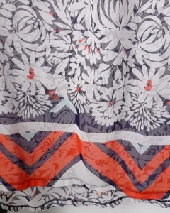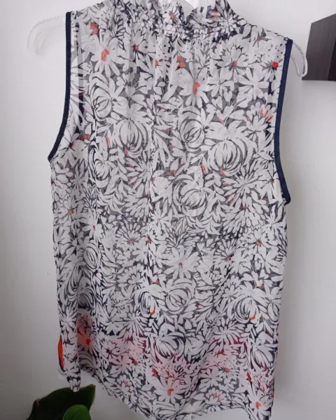 Hermosa blusa estampada con flores blancas con centro naranja y fondo azul.Tiende una coqueta escarola que te hará lucir dulce.Es de poliéster, muy ligera.Se puede llevar con un bra blanco o azul o si eres menos atrevida, puede usarse con un top blanco.Talla grande.Medidas: pecho 54 cm en el frente y 54 cm en la parte de atrás. Largo del frente 67 cm, largo de atrás 74 cm, hombro 7 cm, sisa 26 cm. Perímetro del cuello 53 cm.Muy combinable con unos buenos jeans. 👖