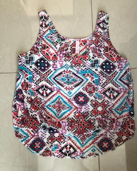 Blusa estampada XHILARATION. Camiseta de dama con estampado lde colores, talla M pero viene reducida, es talla M (viene reducida), y tiene resorte en la parte de enfrente y atras es larga, es totalmente nueva,