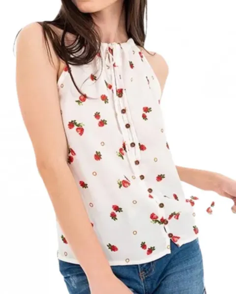 Blusa estampado Fresas Shasa. Blusa blanca con estampado en fresas, sin mangas con lindo lazo en la parte de enfrente para ajustar el pecho y tirantes, talla M Shasa.