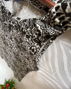 Blusa estampado geométrico en tela rayón y stretch. Escote redondo y de herradura, tiene un collar al rededor del escote el cuál está ligeramente fruncido. Si mangas y de tirantes. Talla: S (26-28) Marca: BANANA REPUBLIC.