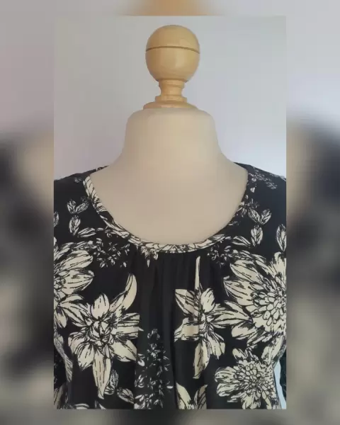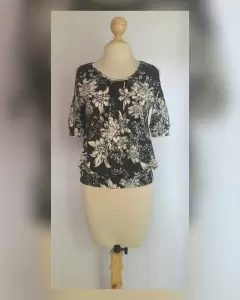 Blusa estilo Gypsy Estampada. Blusa estilo gypsy c/estampado floral en tonos NEGRO ÉBANO/BLANCO LINO, cuello redondo y manga acanalada. Talla G. Dimensiones cms: 33 hombro, 55 axila, 48 zona baja, 54 largo, 32 largo manga. 95% viscosa, 5% elastano. P/lavado en casa.***P/LA COMPOSICIÓN DE LA TELA ES STRETCH P/NO SUBE A LA SIG TALLA***