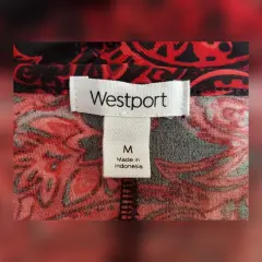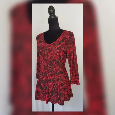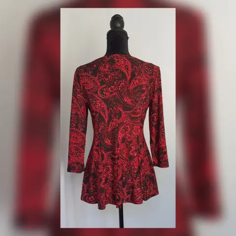 Blusa estilo Peplum estampado Paisley. Blusa estilo peplum estampado paisley bitono NEGRO/ROJO FUEGO, cuello joya y manga 3/4. Talla M. Dimensiones cms: 37 hombro, 50 axila, 44 cintura, 86 zona baja, 62 largo, 49 largo manga. 95% poliéster, 5% spandex. Para lavado en casa.