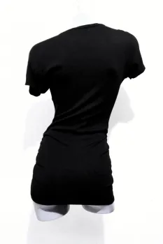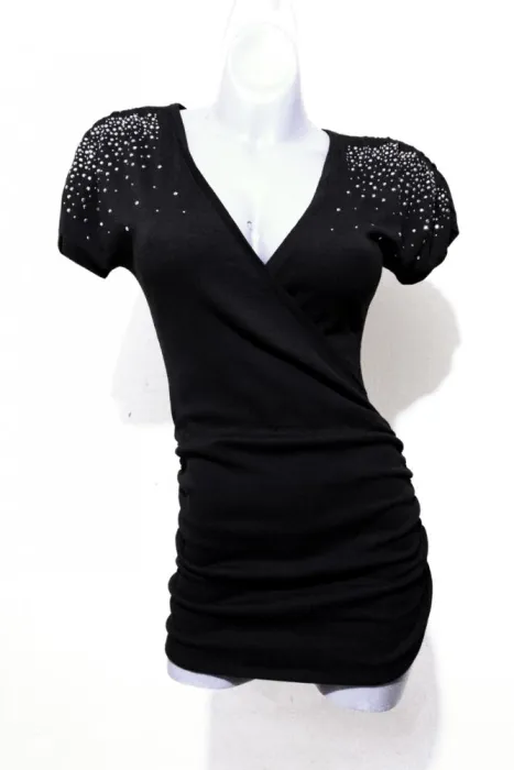 COLOR NEGRO, CON APLICACIONES EN HOMBROS, ESCOTE EN V, TALLA CHICA, PODRIA QUEDAR TAMBIEN A UNA TALLA MEDIANA, MEDIDAS DE UNA CARA: AXILA A AXILA 42 CM (ESTIRA HASTA LOS 58 CM), LARGO 72 CM.