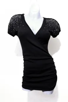 BLUSA EXPRESS TALLA CHICA. COLOR NEGRO, CON APLICACIONES EN HOMBROS, ESCOTE EN V, TALLA CHICA, PODRIA QUEDAR TAMBIEN A UNA TALLA MEDIANA, MEDIDAS DE UNA CARA: AXILA A AXILA 42 CM (ESTIRA HASTA LOS 58 CM), LARGO 72 CM.