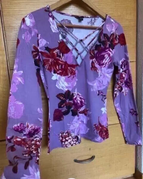 Hermosa Blusa Floral GUESS en color violeta con diseño floral. Precioso y delicado cruce en descote en V. Tela suave en strechs. Talla XS tambien queda a S.