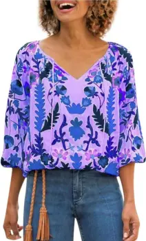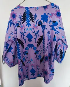 Blusa morada floral, usada 1 vez, sin detalles casí como nueva .Talla (dice 3XL) pero queda bien a la talla XLMedidas axila a axila 56 CmsLargo 68 cm