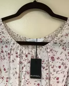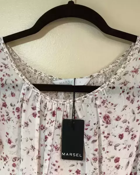 Blusa floral transparente. Blusa floral transparente Escote redondoCon olanes en mangas La etiqueta dice talla 4, queda a GMarca MarselMulticolor estampadoLa etiqueta dice 100% viscosa pero se siente como poliéster