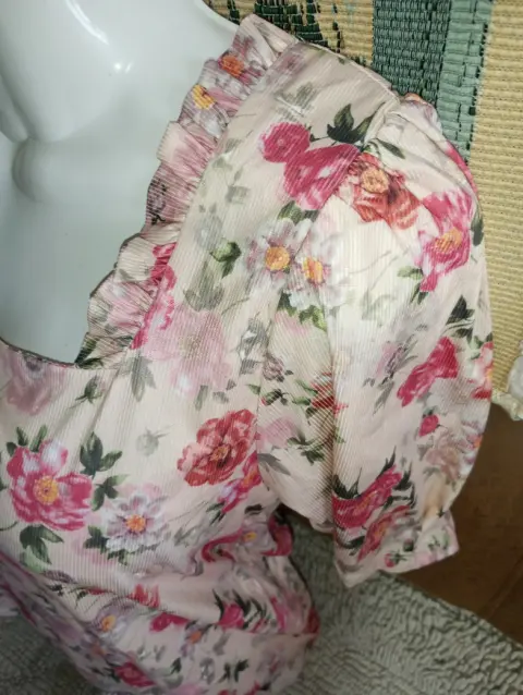 Hermosa blusa corta tipo crop top, cuello cuadrado con olanes, manga corta, tela super suavecita y fresca, estira un poco, estampado floral, cuenta con un pequeño detalle (un hoyito) el cual pasa desapercibido. Marcada como talla G pero da más a M. Muy hermosa.