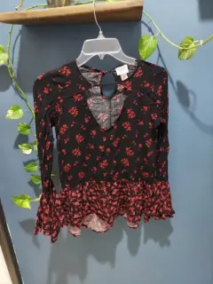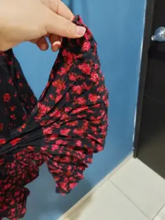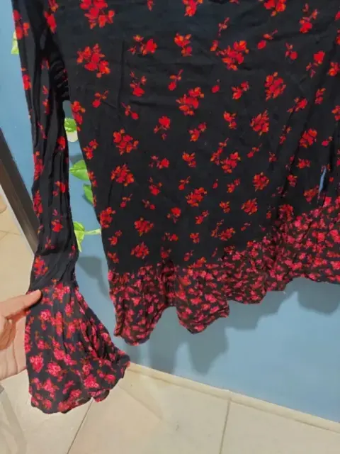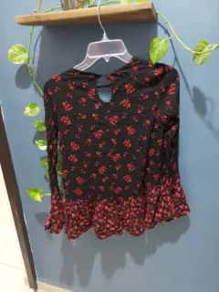 Blusa floreada con olanes. Bonita blusa fresca con olanes, y estampado de flores negras y rojas