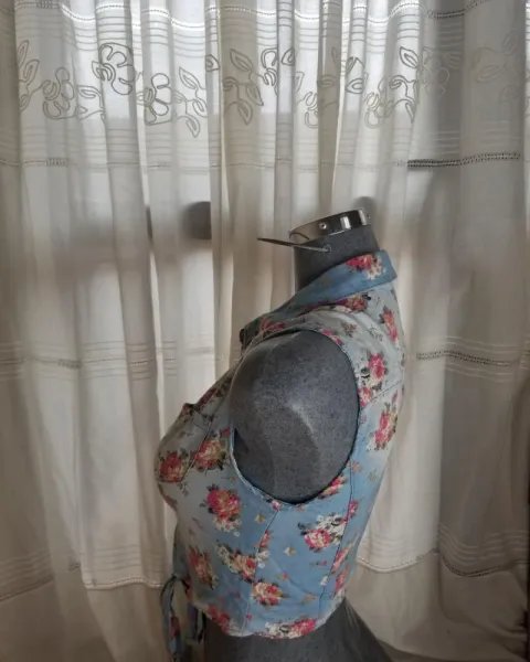 Blusa floreada de mezclilla. Blusa floreada tipo camisa de mezclilla sin mangas para dama, talla s.