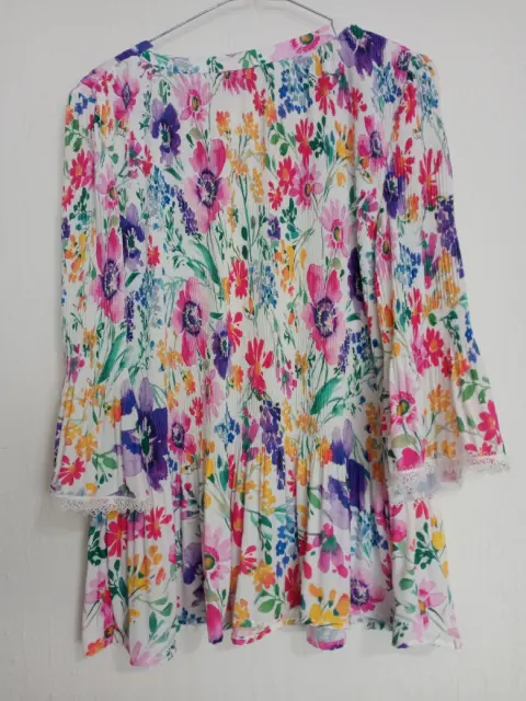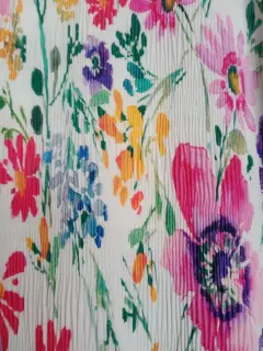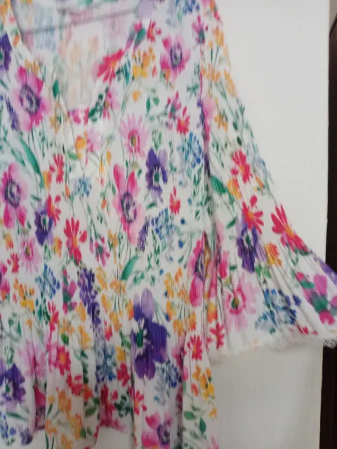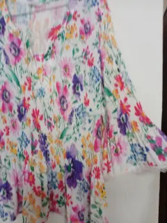 Hermosa blusa de colores fiusha, morado,verde, rosas. Con flores. Marca Punto Roma. Talla M. Amplia. Mide de hombros 40cm. Largo 63cm y de sisa 52cm. Tela es corrugada . Con un lindo olán abajo. Cuello V con lindo encaje . Al igual que las mandas 3/4 con lindo olán y encaje al final. Buen estado usada pocas veces. Linda caída .se lava en casa. Es fresca y viste muy bien.